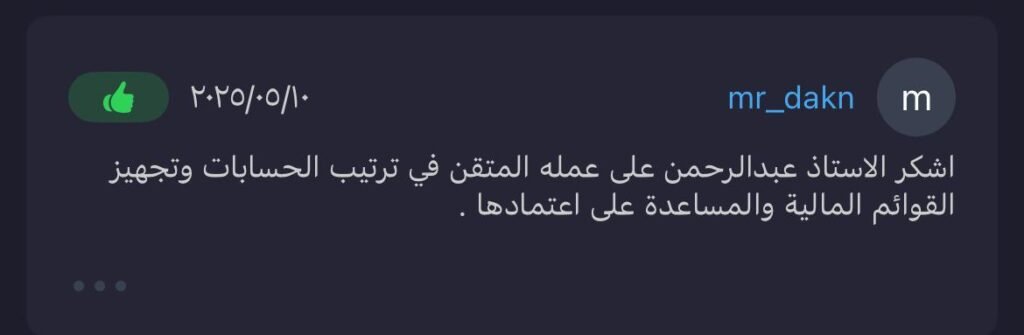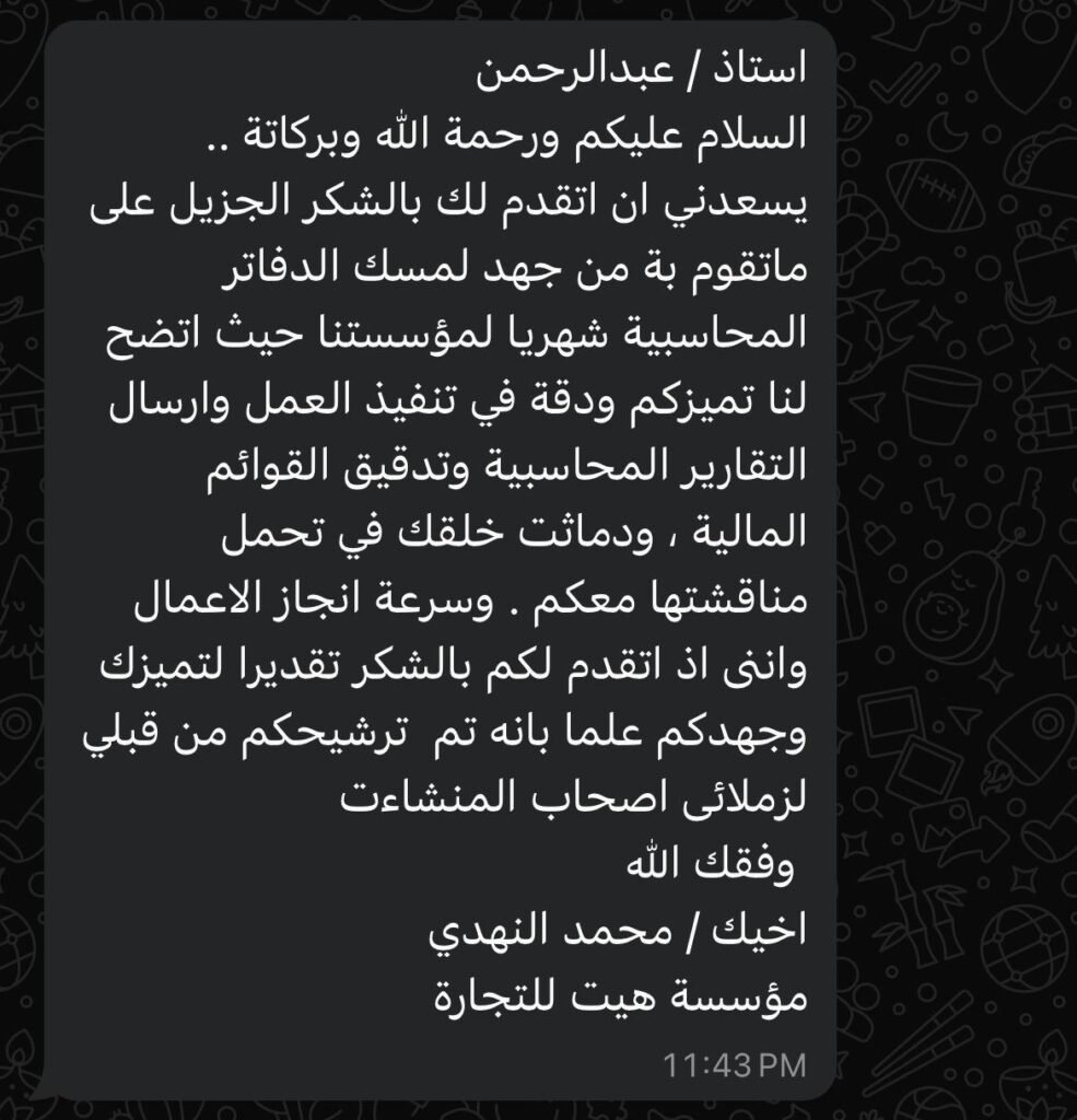 أشكر الأستاذ عبدالرحمن على عمله المتقن في ترتيب الحسابات وتجهيز القوائم المالية والمساعدة على اعتمادها.