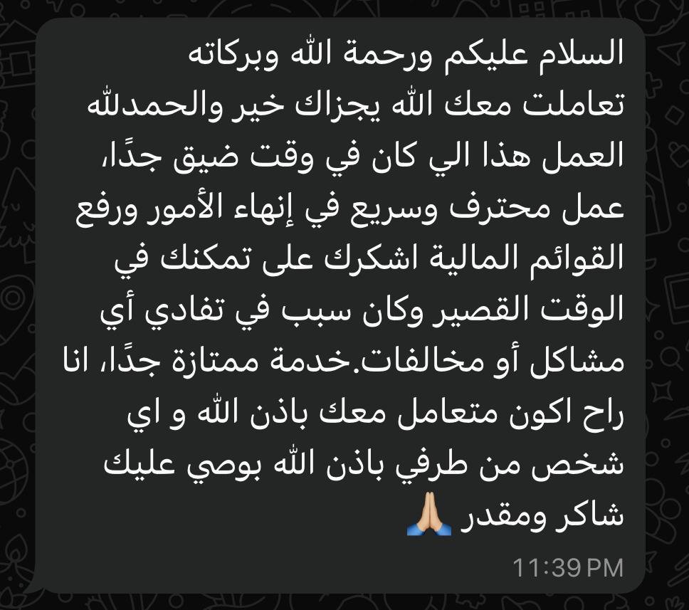 اشكرك على تمكنك في الوقت القصير وكان سبب في تفادي أي مشاكل أو مخالفات.