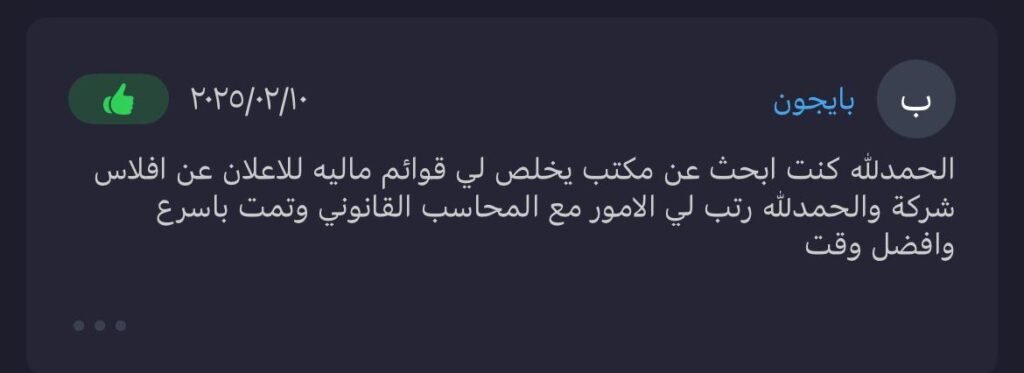 الحمدلله كنت ابحث عن مكتب يخلص لي قوائم مالية للإعلان عن إفلاس شركة والحمدلله رتب لي الأمور مع المحاسب القانوني وتمت بأسرع وأفضل وقت.