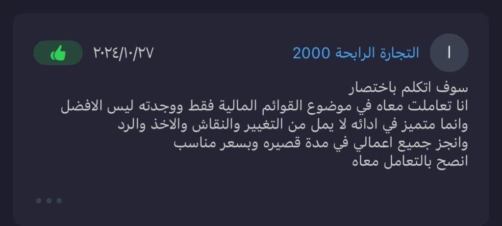 فيما يلي بعض آراء عملائنا الذين تعاملوا معنا في إعداد وتجهيز القوائم المالية، وتنظيم الحسابات، وتقديم الاستشارات المحاسبية.